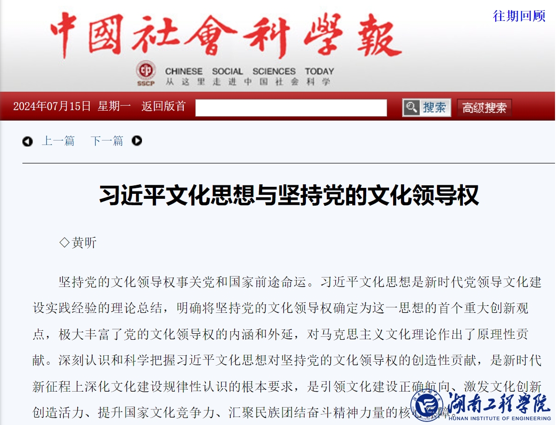 7月15日,《中国社会科学报》头版头条刊发我校党委书记黄昕教授的理论文章《习近平文化思想与坚持党的文化领导权》。《中国社会科学报》是由中国社会科学院主管主办、中国社会科学杂志社编辑出版,面向全国理论界、学术界的大型理论、学术报纸,是全国第一份全国性的理论、学术专业报纸。