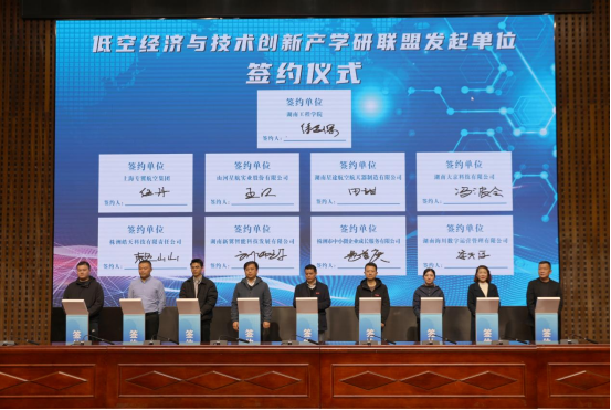 校党委书记黄昕,校党委副书记、校长易兵,湘潭市委宣传部副部长、市社科联党组书记、副主席李锋,学校低空经济与技术创新研究院执行院长徐运保共同为低空经济与技术创新研究院揭牌。校党委委员、副校长张小刚参加并见证签约时刻。学校联合上海专翼航空集团、山河新航实业股份有限公司、湖南星途航空航天器制造有限公司、湖南新翼智能科技发展有限公司等省内外8家低空经济领域代表企业共同发起成立了湖南低空经济与技术产学研联盟,并现场签约。株洲市芦淞区人民政府、湘潭大学、长沙理工大学、湖南科技大学、湖南工业大学、湖南理工学院等单位作为联盟指导单位参加会议。我校低空经济与技术创新研究院专兼职研究员、相关部门及教学院负责人和师生代表共同见证。揭牌和签约仪式由校党委委员、副校长魏克湘主持。