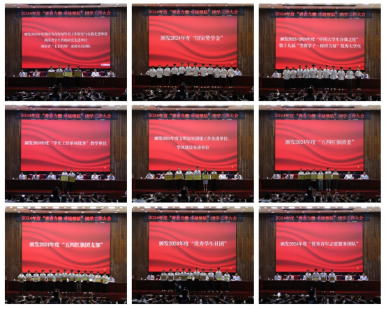 会议对在2024年高校辅导员工作研究与实践、学生资助、“七彩假期”志愿服务、国家奖学金、“中国大学生自强之星”、“芙蓉学子·榜样力量”等评选中荣获全国、湖南省先进集体、优秀团队和个人予以表彰;对在2024年度学校团学工作中表现突出的各类集体和个人等予以表彰。选树典型榜样,激发奋进力量。
