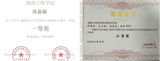 第三次党代会以来,学院学子积极参加各项比赛和竞赛活动,成绩喜人。在第五届省大学生工程训练综合能力竞赛中,学院与工程训练中心精心组织三本各专业学生联合组队参赛,取得3项一等奖、1项三等奖的优异成绩,学院获优秀组织奖。2019年荣获第八届湖南省大学生机械创新设计大赛团体二等奖1项、第八届全国大学生金相技能大赛个人二等奖1项、“湖南建工杯”第七届大学生结构设计竞赛团体三等奖1项、湖南省大学生电子商务大赛团体三等奖2项、个人三等奖2项、湖南省工程训练综合能力竞赛个人三等奖2项等优异成绩。2020年在第九届湖南省大学生机械创新设计大赛中荣获2个二等奖、1个三等奖,在湖南省第26届普通高校大学生英语演讲比赛中荣获专业组个人一等奖1项,二等奖2项并获得团体二等奖。荣获2020年湖南省第三届大学生电子商务大赛三等奖1项。