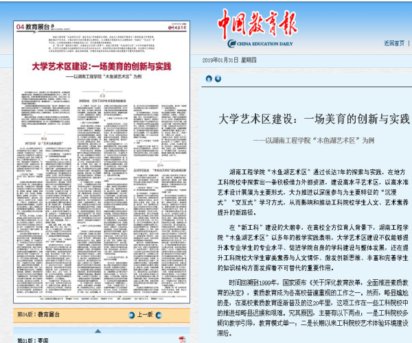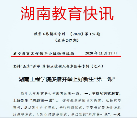 工作经验获上级肯定。获得2015年湖南省普通高等学校校园文化建设优秀成果一等奖1项,实现了我校在校园文化建设成果奖上的突破。在2016年度湖南省普通高校新闻宣传工作年度考核中排名12,获得最佳进步奖。一件作品获得2019年度湖南教育好新闻三等奖,受到湖南省教育厅表彰。《湖南教育快讯》专题推介了我校《坚持“五育”并举,落实立德树人根本任务》的经验做法。学校高度重视,坚持多方式教育、多层次联动、多部门协作,共同上好新生“第一课”。