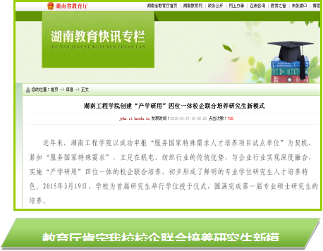 服务需求,培养成效显著。截至2021年3月,我校共招收全日制研究生483人,授予硕士专业学位293人,研究生共发表学术论文近400篇,授权专利117项,获国家级、省级以上学科竞赛奖励近70项。毕业生工程实践能力和应用创新能力强,就业率、好评率均为100%,大多成为国内知名风电、纺织企业的技术骨干或技术主管。研究生教学成果获省教学成果二等奖和中国纺织高等教育教学成果一等奖,获湖南省优秀硕士论文3篇。人才培养特色被教育部作为典型推介,中央电视台、光明日报、中国学位与研究生教育网等媒体做了广泛报道。