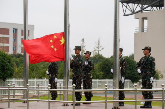 英姿飒爽的国旗护卫队,昂首阔步地护卫着国旗,伴随着国歌声的响起,五星红旗冉冉升起,2021级新生军训团成果汇报暨总结表彰大会在庄严的升旗仪式中拉开序幕。