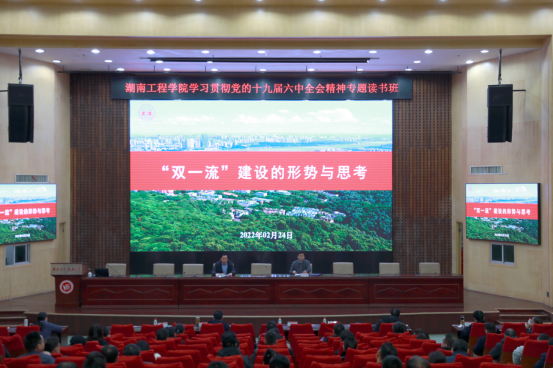 2月24日下午,我校学习贯彻党的十九届六中全会精神专题读书班第二场专题学习在一报告厅举行。为促进学校高质量发展,有效推动“双一流”建设,学校特邀湖南大学发展规划办公室(重点建设办公室)常务副主任李丰涛作题为“‘双一流’建设的形势和思考”的辅导报告。党委委员、副校长魏克湘主持报告会。
