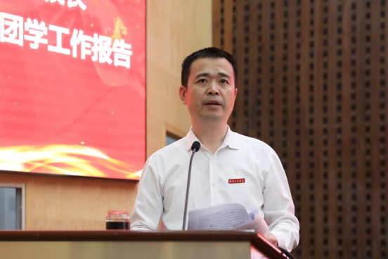 树立榜样,传承奋进力量,展现湖工青年的时代风貌,4月26日下午,我校在一报告厅召开“喜迎二十大 永远跟党走 奋进新时代”2021年度团学工作总结暨表彰大会。全体在家校领导、党委委员出席大会并为受表彰的集体和个人颁奖,相关职能部门负责人、全体辅导员、获奖教师代表及青年学生代表参加。会议由党委副书记、校长易兵主持,党委书记陈岳堂作总结讲话,党委委员、副校长张小刚作大会主题报告。