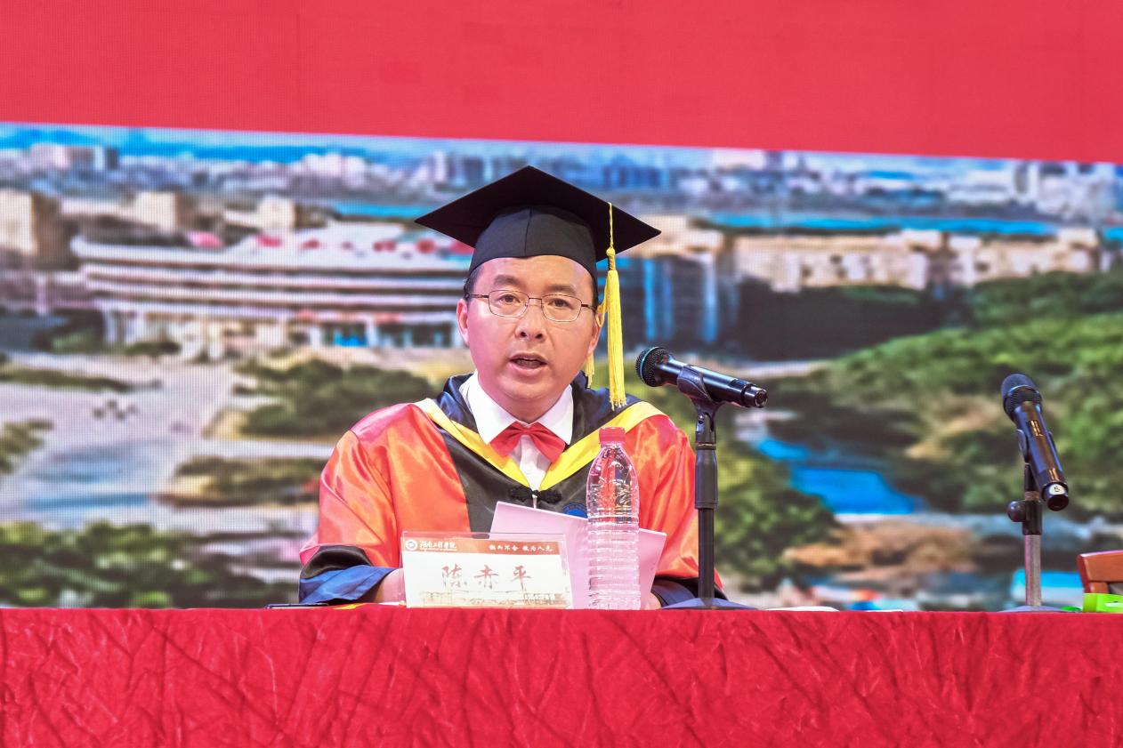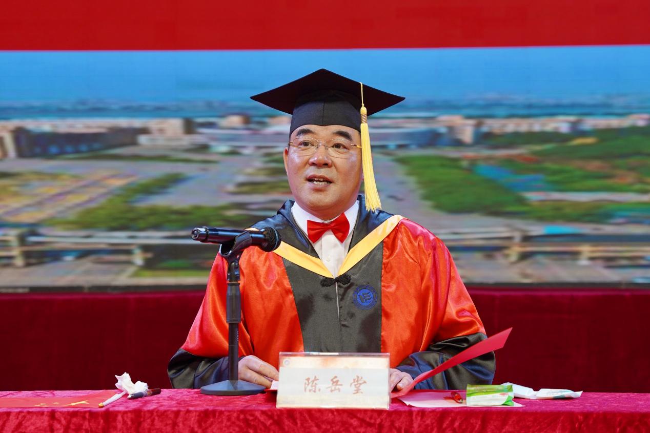 对于即将告别学校、带着憧憬、奔向前方的毕业生们,陈岳堂满怀嘱托。他对毕业生提出四点希望,一是要始终保持慎思明辨的能力,以厚德载物自许,在是非、曲直、善恶之间做出明确判断和理性选择,不负伟大时代;二是要勤于学习、善于学习、持续创新,努力成为以“变革”为主题词的大时代里的弄潮儿;三是要秉承“锲而不舍 敢为人先”的校训精神,用虚怀若谷的胸怀,海纳百川的态度,立大志、明大德、成大才、担大任,以奋进的姿态书写出无愧于时代的人生篇章;四是要以理想为引领,以信仰为支撑,坚守善良、公正、勤奋、智慧的初心,用绚烂的青春书写人生的答卷。