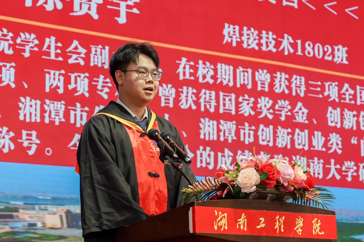 “同学们,今天,我们即将走出校园,面对未来千千万万条路,我希望我们都能选择那条最难走的路,‘自迩而远,自卑而高。’领略难寻的风景,实现最美的初衷!”毕业生代表焊接技术1802班陈赞宇表示。