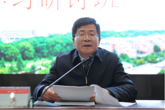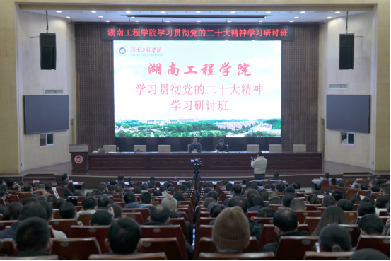 奋进新征程,展现新担当。为深入学习贯彻习近平新时代中国特色社会主义思想和党的二十大精神,引导广大党员干部、全体师生坚定信念、同心同德、埋头苦干、奋勇前进,推动学校各项工作高质量发展,2月16日上午,我校学习贯彻党的二十大精神研讨班在一报告厅开班。原党委书记陈岳堂教授主讲第一课,党委副书记、校长易兵主持。在校校领导、党委委员、中层以上干部,教研室主任、副主任,科级干部、岗位负责人、专职组织员参加。