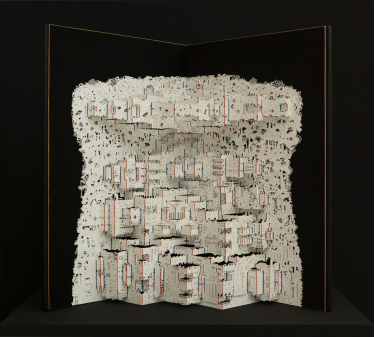 展会现场围满了“二刷”“三刷”《碳折叠NO.3》的观众,纷纷对作品的构思与技法展开讨论。《碳折叠NO.3》是唐征维碳折叠系列作品中的第三件,他尝试将排放的主要基础——工业体组合成一个“排放帝国”。在手法上融合剪纸与立体折纸技法,最后形成书籍的样式。唐征维希望通过纸艺术作品的形式阐述对碳金融背后的权力架构的思考。