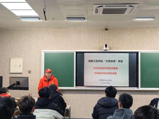 为进一步提升育人成效,马克思主义学院积极推进“大思政课”建设。12月9日,学院邀请优秀党员志愿者欧阳振鸿来校,在A502智慧教室为学生们带来了一场生动的讲座。此次讲座旨在弘扬志愿服务精神,激励青年学子积极投身社会公益事业,增强社会责任感与使命感。400多学生线上参与学习。