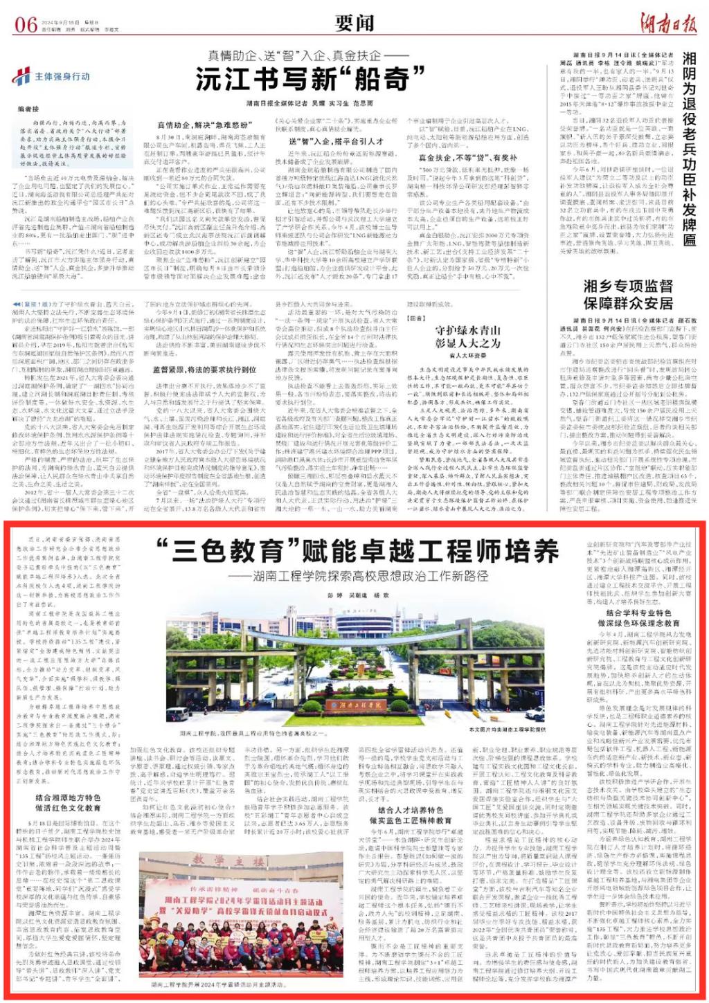 为破解卓越工程师培养中思想政治教育与专业教育深度融合难题,87978797威尼斯探索出一条通过“三个结合”实施“三色教育”的思政工作模式,即:结合湘潭地方特色实施红色文化教育;结合人才培养特色实施蓝色工匠教育;结合学科专业特色实施绿色环保教育,推动新时代思想政治工作守正创新发展。