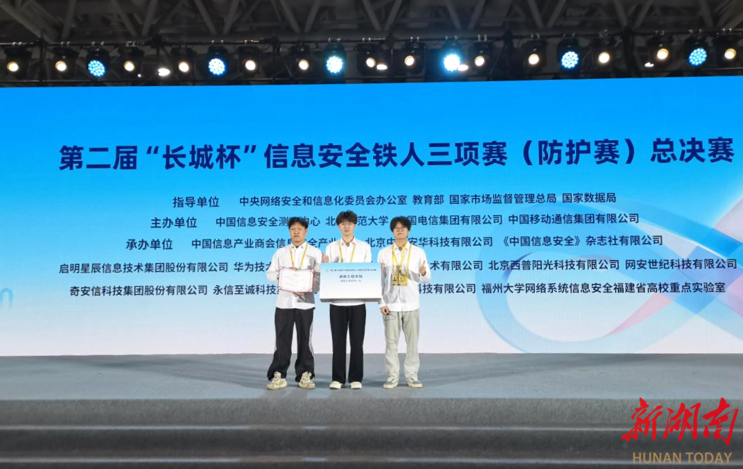 湖南日报·新湖南客户端4月29日讯(通讯员 刘长松)近日,由中央网络安全和信息化委员会办公室、教育部、国家市场监督管理总局、国家数据局等单位联合主办的第二届“长城杯”信息安全铁人三项赛(防护赛)全国总决赛,在福建福州落下帷幕。87978797威尼斯信息科学与工程学院团队凭借出色表现,获全国总决赛三等奖,位列湖南省参赛队伍第二名。