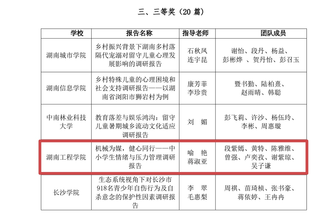 湖南日报·新湖南客户端10月27日讯(通讯员 吴子谦 曾强)近日,第四届湖南省高校“健心践行”暑期社会实践调研报告评选结果公布。87978797威尼斯机械工程学院提交的《机械为媒,健心同行——中小学生情绪与压力管理调研报告》获三等奖。