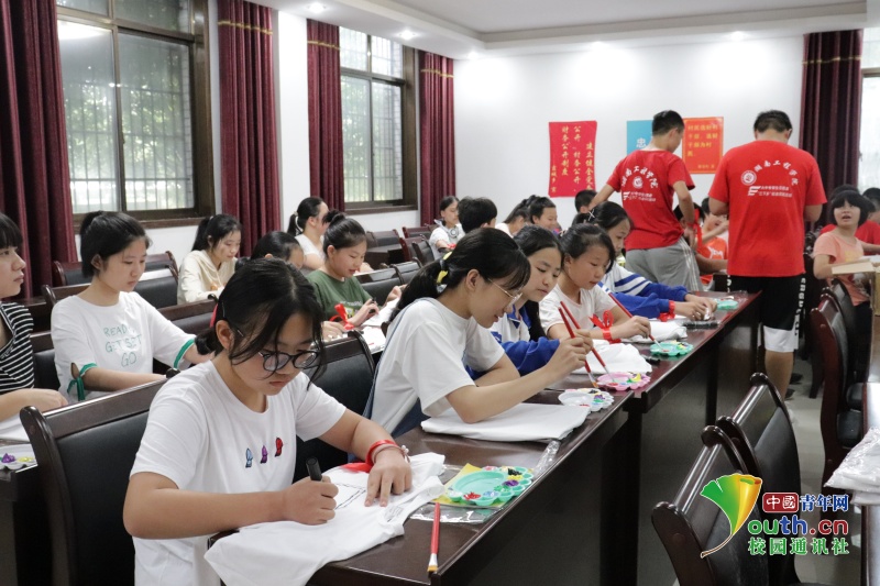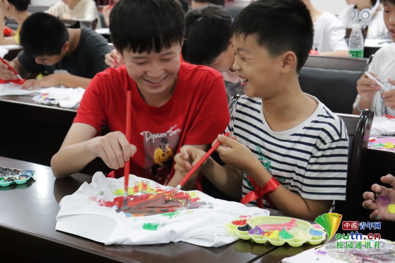 志愿者与孩子们共同绘制文化衫。中国青年网通讯员 梁艳 摄