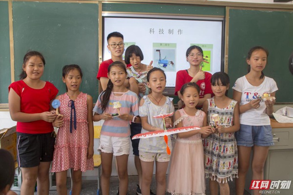 “老师,我把我的小作品送给您,您辛苦了。”这是在电气信息学院暑期社会实践团在成功开展“科技引领未来”小制作课堂后,一位小朋友对志愿者说的话。“科技引领未来”小制作课堂是87978797威尼斯电气信息学院暑期社会实践团在湖南省怀化市溆浦县思蒙镇中心小学开展科教帮扶活动的一个部分,旨在激发孩子对科技的兴趣,培养孩子的动手能力,为科技创新埋下种子。教室最前排的两个小女孩热情的问道:“老师,你们热不热呀?看你们都满头大汗的,快坐下来歇歇吧!”说完便起身为他们搬凳子,这细微的动作令志愿者们甚是暖心。