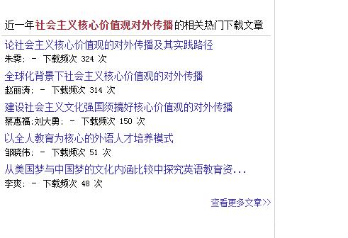 朱霁副教授的论文观点新颖,论证充分,是该研究领域具有创新性的研究成果,受到了相关专业领域研究者的广泛关注,在近一年“社会主义核心价值观对外传播”相关热门下载文章中居首位,热点关注度4.3。由此可见朱霁副教授的论文在该研究领域产生了一定的学术影响力。